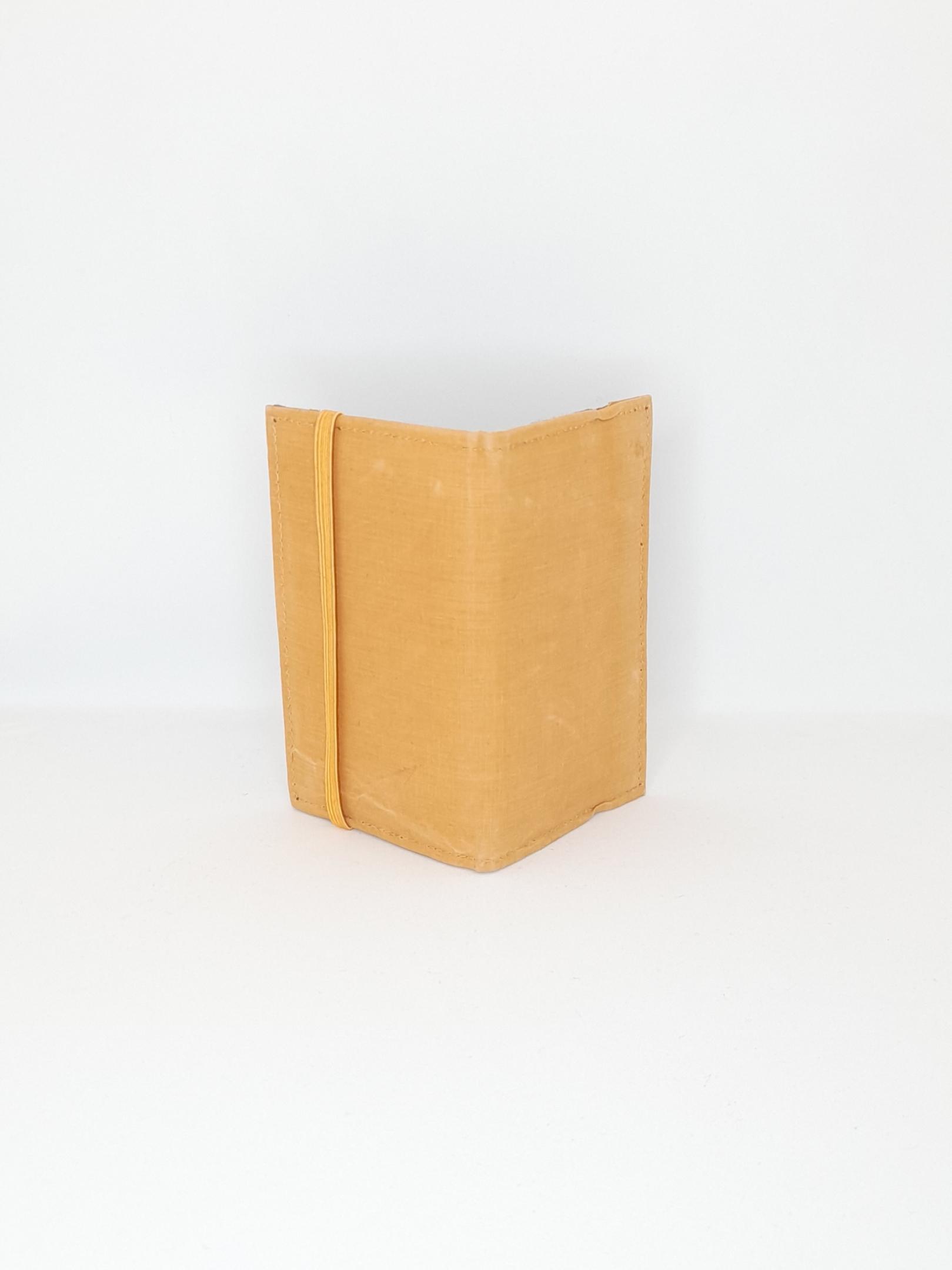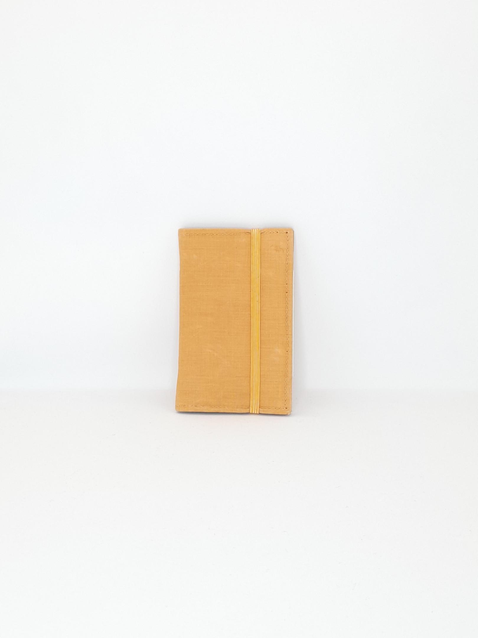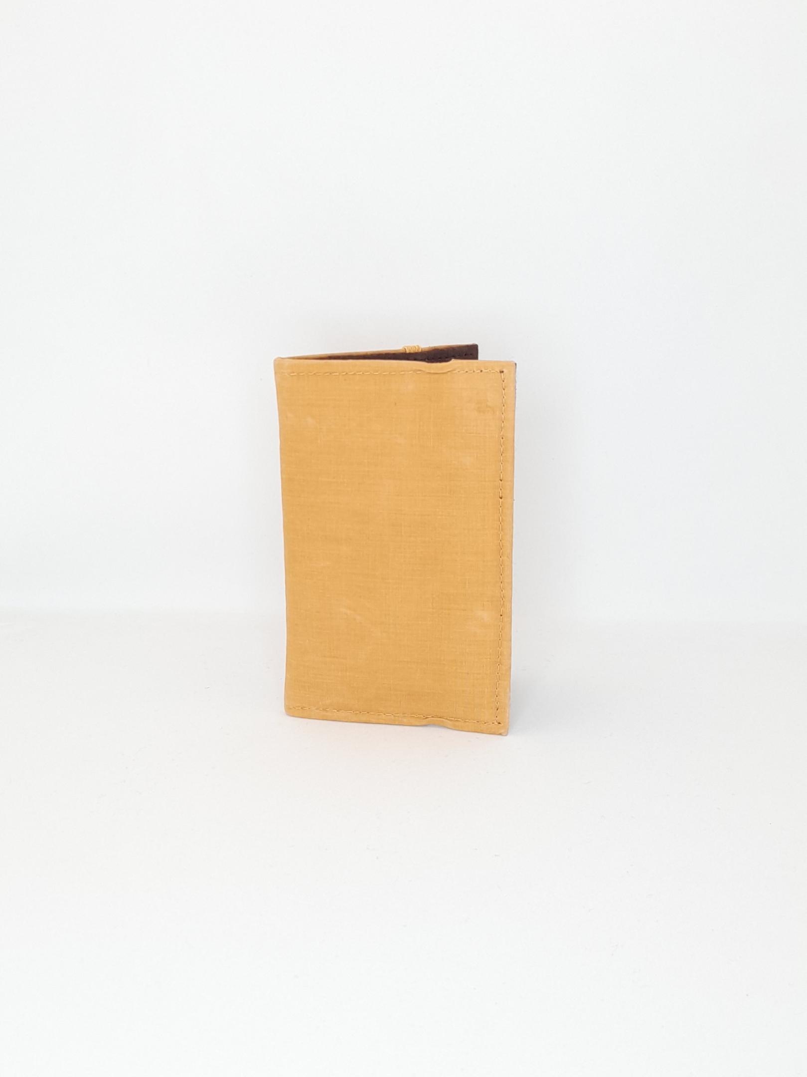 This wallet is made from hand dyed organic bamboo. The cloth is a remnant cut from a shirt made in the same cloth. The dye is from turmeric. Made by artisans in India through Kapdaa The Offcut Company.